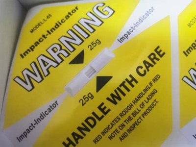 物流监视器只需在物品外包装的正面和倾面的左上角各安装一个。这样做是为了物品在受到来自前、后、左、右、上、下等不同角度的倾斜、倒置、和震动时,物流监视器准确地监控及记录。每一个物流监视器都附带有一张13.8x28.4cm警示标签,该警示标签和物流监视器一起贴在物品外包装上。警示标签上有醒目的标语和设有10个正常状态的交接标记栏、1个异常状态的交接记录栏。在物品的物流作业环节中,由于涉及的人员和环节够多,因此,在每一个环节在交接的过程中,双方可以通过物流监视器的状态确认并在正常或异常状态栏作标记和描述,从而划分责任点。如果货物在运输途中,倾斜、倒置、和震动超出正常的范围值时,物流监视器的指示钢珠或粉末会掉落至相应的异常区域,此时,正常区域将并变为红。
